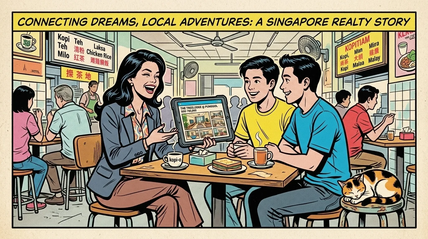Notice something in that image? The agent isn't pointing at a "Sold" sign. She’s having a real conversation. She’s at a local spot. She even has a cat nearby (because, let’s be honest, everyone loves a good office cat: or in this case, a kopitiam cat).